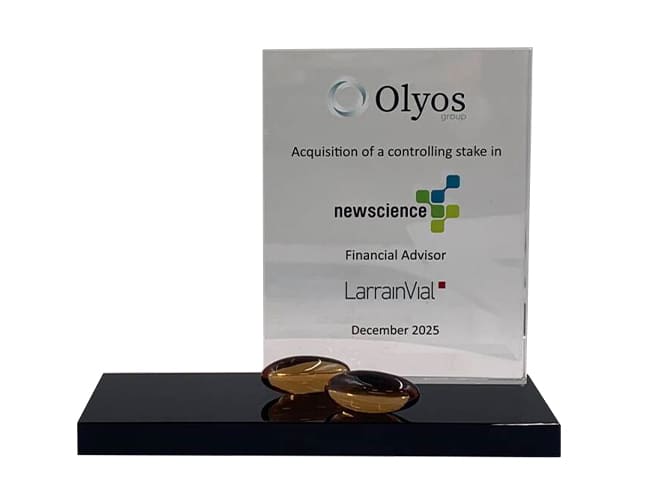 The blue base matches the brand’s color. A corporate design that commemorates a strategic sale transaction.