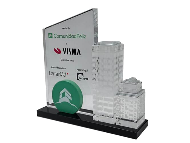 As we can see, we have a rectangular glass frame that simulates a picture frame and can hold several photos. On the other hand, we have a black glass frame with the transaction details. This trophy was made for our client Larrainvial in Chile.