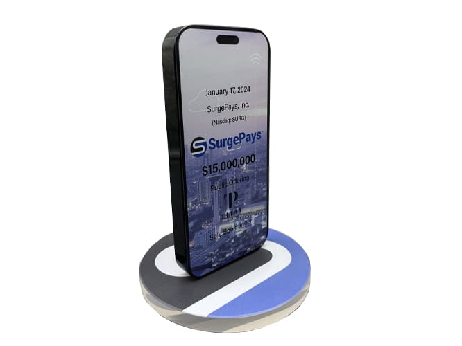 Nice 3D Mobile themed replica trophy celebrating SurgePay public offering providing traditional wireless services.