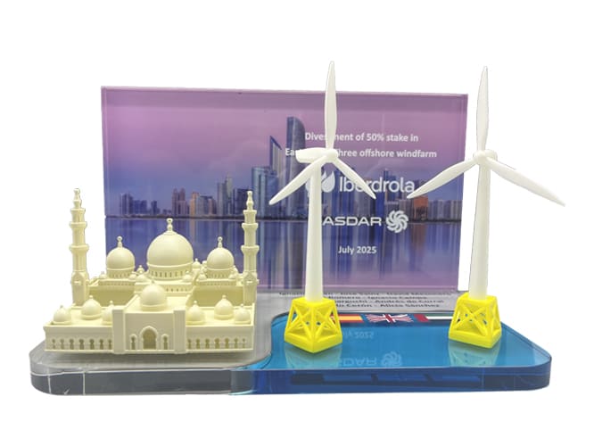 We specialize in creating highly customized deal toys that reflect the unique identity of each transaction, including complex energy infrastructure. We can also incorporate solar panels and 3D transmission towers in metal and crystal replicas.