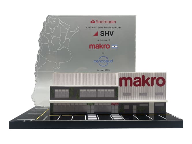 Trophy with a black glass base that simulates the parking lot of a Makro store. On top of the base is a 3D replica of one of the stores. Behind it, we can see a glass plaque with the details of the transaction and a section of the map of Argentina.