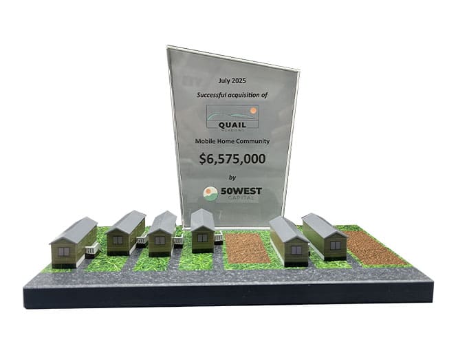 Unique Real Estate theme corporate trophy, incorporating mini 3D printed homes with a grass image etched on the base. Deal Text engraved on a frosted crystal.