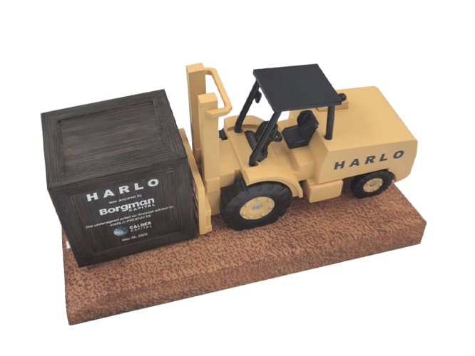 Extravagante trofeo financiero. Como se puede observar, el trofeo posee una base de cristal negro u una réplica en 3d de un montacargas. El mismo simula que va a cargar las cajas, las cuales están hechas en resina. Este fue un premio realizado para uno de nuestros clientes en Perú.
