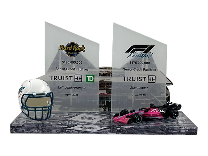Trofeo 3D creativo que presenta una réplica detallada de una gorra de hockey y un auto de Fórmula 1, con base impresa al reverso. Ademas un corte de cristal del Hard Rock Stadium en la parte trasera y la información de la transacción elegantemente mostrada en un panel frontal esmerilado.