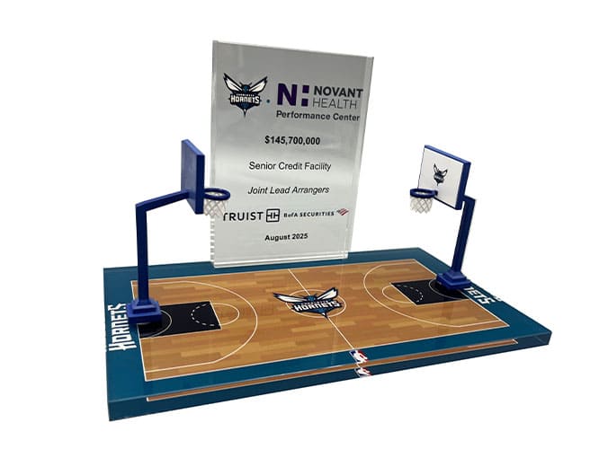 Creativa réplica 3D impresa del campo de baloncesto de los Charlotte Hornets en resina y acrílico para celebrar una operación de financiamiento mediante una línea de crédito senior.