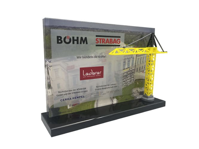 Creado para una prestigiosa firma de banca de inversión en Frankfurt, este trofeo personalizado de grúa de construcción impreso en 3D honra un hito importante.