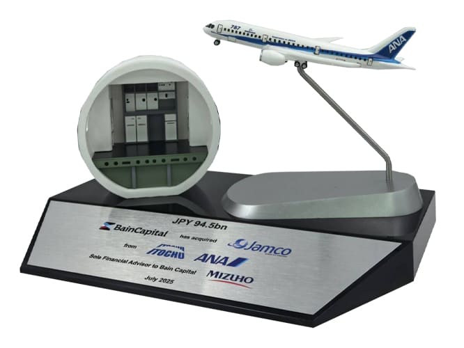 Sin duda, un trofeo 3D único que incorpora un modelo de avión fundido en aleación de zinc, con detallados elementos interiores también en 3D. Un trofeo financiero excepcional que tuvimos el placer de crear para nuestro cliente Mizuho Securities en Japón.