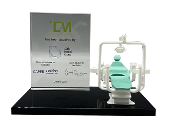 Bonita placa personalizada en 3D con forma de sillón dental, elaborada en acrílico y resina, con el texto del deal sobre un bloque de cristal transparente.