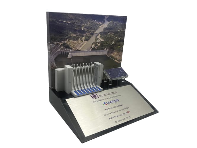 Trofeo de infraestructura con base a 45° de cristal negro y placa de metal grabada. Incluye réplicas 3D de una represa hidroeléctrica y un panel solar, conmemorando un proyecto de energía híbrida.