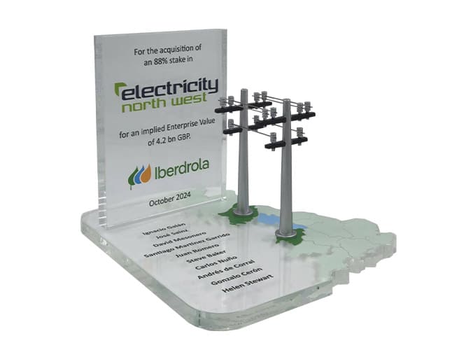Trofeo corporativo extravagante celebrando una adquisición de un campo eolico este proyecto elaborado para nuestro cliente Aes.