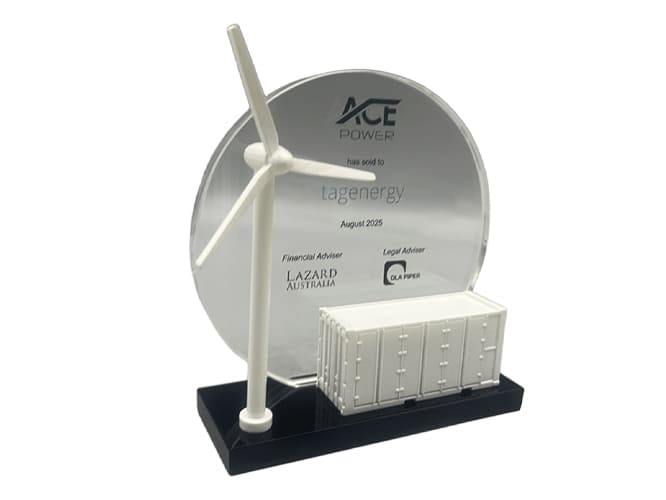 Este tombstone de energía renovable a medida, creado para Lazard Australia, incorpora una réplica 3D de un aerogenerador y un sistema de almacenamiento en baterías, simbolizando la innovación y el avance de la infraestructura de energía limpia.