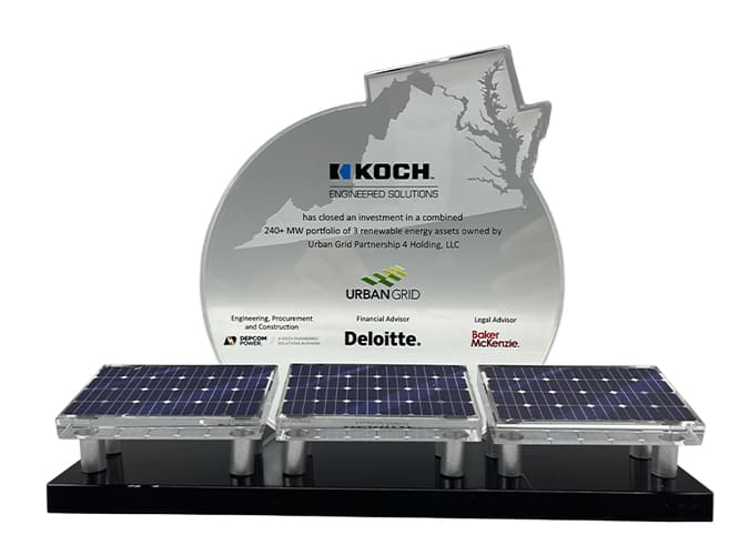 Este tombstone financiero a medida fue creado para Deloitte con el fin de conmemorar una reciente transacción en el sector energético. Los detalles de la operación están elegantemente grabados en una forma circular de cristal, que incorpora los contornos de Virginia y Maryland. El círculo de cristal descansa sobre una base plana de cristal negro, acentuada con tres paneles solares en miniatura de cristal.