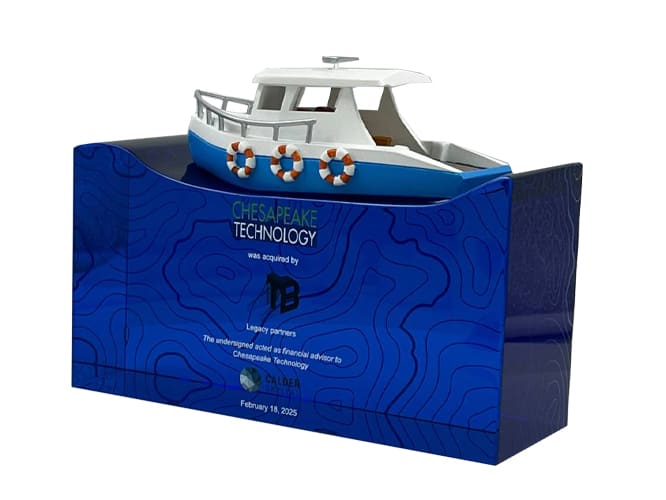 Creamos un trofeo personalizado para conmemorar la adquisici贸n de Chesapeake Technology. La pieza presenta una detallada r茅plica en 3D de un barco, colocada sobre una base de acr铆lico azul profundo grabada con l铆neas topogr谩ficas que evocan mapas n谩uticos.